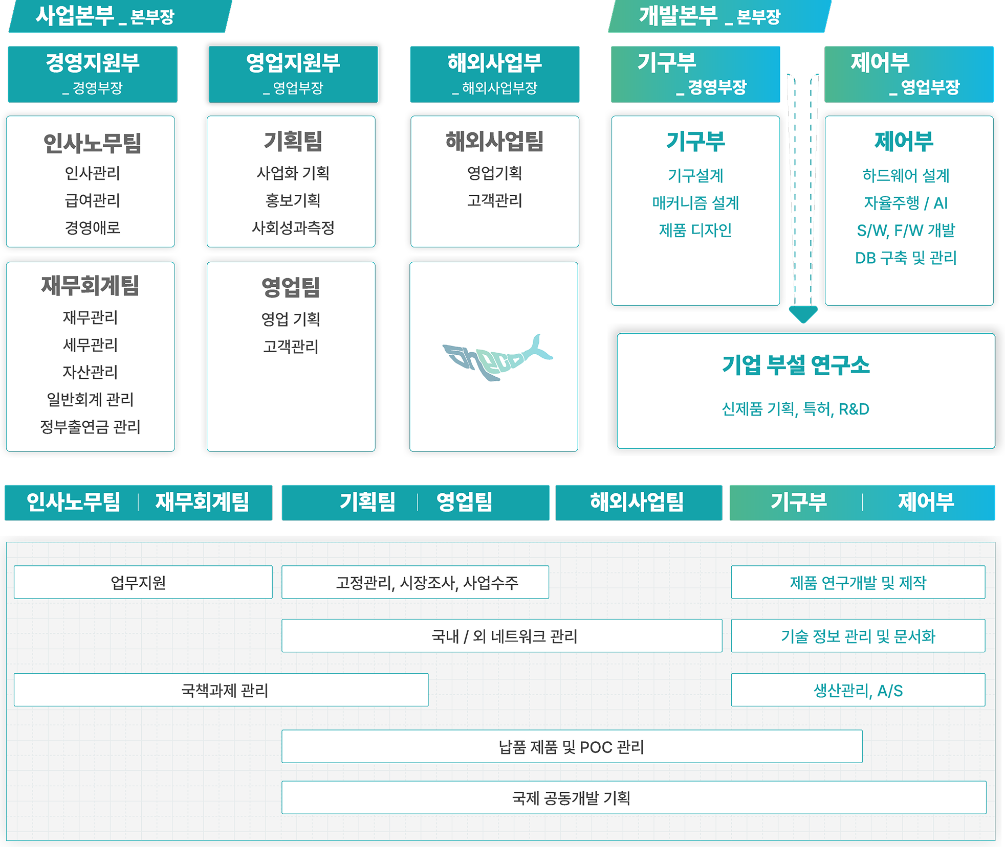 자사는 사업본부, 개발본부 두개의 본부로 이루어졌으며 보다 높은 효율성을 높히기 위해